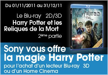 Sony propose pour l’achat d’un lecteur Blu-ray 3D ou d’un Home Cinéma le Blu-ray 3D de Harry Potter et les reliques de la Mort 2ème partie en cadeau. Valable du 1er novembre au 31 décembre 2011 sur les références suivantes : Lecteurs Blu-ray BDPS480, BDPS580, BDPS780 ou Home Cinéma BDVL600, BDVL800, BDVL800M, BDVE280, BDVE380, BDVE780, BDVE880, BDVE980, BDVIZ1000.