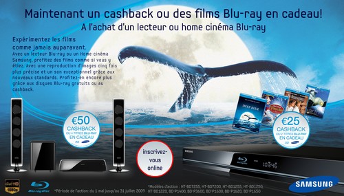 Lecteurs belges ou luxembourgois, sachez qu’à l’achat d’un de ces lecteurs : BD-P4600, BD-P3600, BD-P1600, BD-P1620, BD-P1650 entre le 1er mai jusqu’au 31 juillet 2009, Samsung vous offre un cashback de 25 euros ou 2 Blu-ray en cadeau. Pour l’achat d’un Home Cinema, il s’agit alors d’un cashback de 50 € ou de 4 films en cadeau, voici les produits concernés : HT-BD7255, HT-BD7200, HT-BD1255, HT-BD1250, HT-BD1220.